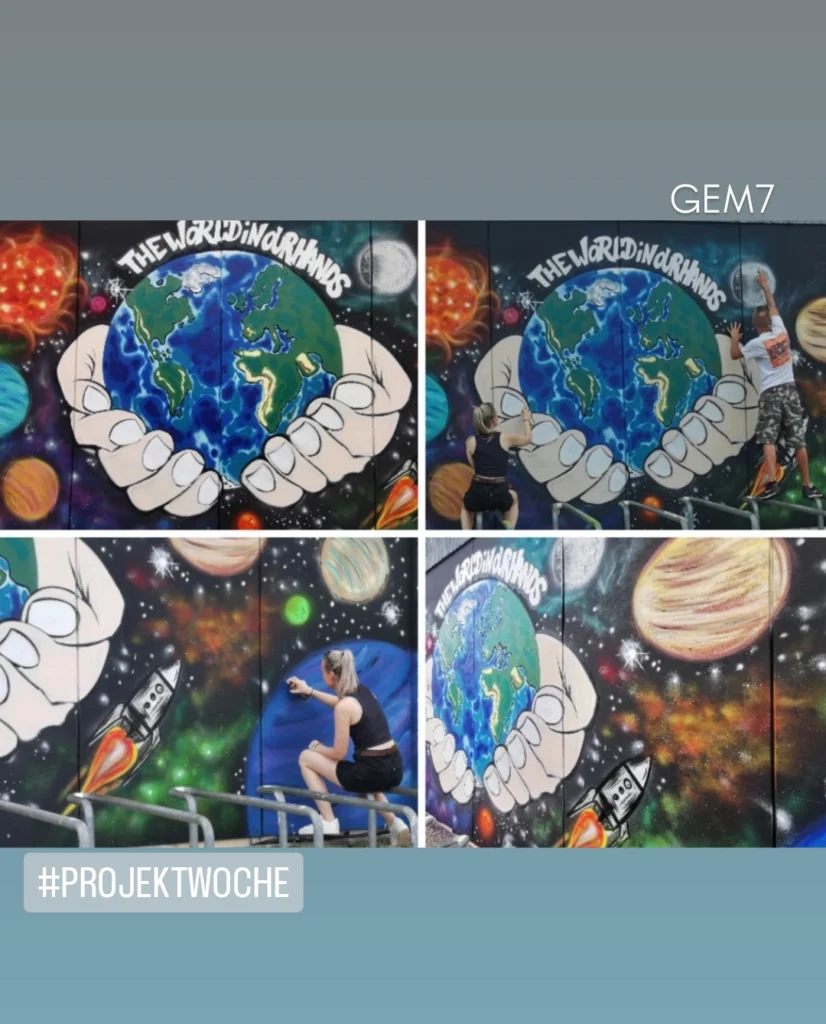 Viele tolle Projekte fanden unter dem Motto „Selbstwirksamkeit in Schule“ an der GEM7 statt. Unter anderem wurden Klassenräume und Flure neu gemalert, Eingangsbereiche gestaltet, neue Sitzmöglichkeiten aufgebaut und unser Grüner Schulhof gepflegt. Versorgt wurden die Kids und LehrerInnen mit leckeren Speisen von unseren kleinen Bäckern.